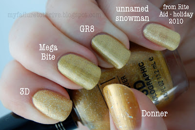 I intended to take these photos outside, to show of the holo as much as possible, but my camera died, and by the time the battery was charged up, the sun was gone. The lamp acted as a reasonable facsimile. As you can see, GR8 is the only linear holo, though Mega Bite may be in ideal lighting conditions. The holo particles are large, and more sparse than those in GR8, though not as large, or sparsely distributed as 3D. Donner and the snowman are both gold bases with holo glitter, and I'm inclined to lump 3D into that category as well.